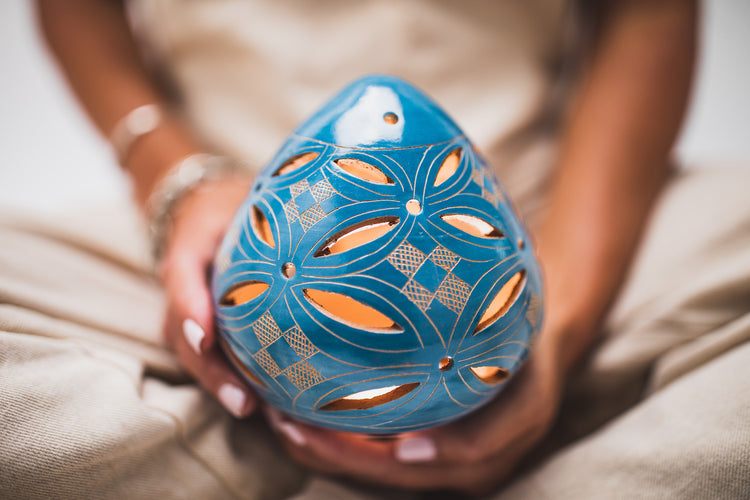 All of our luminaries are made by artisans in San Juan de Oriente, Nicaragua. This small town is known for generations of ceramicists passing along their traditional work to their children and grandchildren. Each piece is created on a non-electric kick-wheel, hand-painted, and drawn with a sharpened bicycle spoke. Can you imagine, using a bicycle spoke to create the butterflies and turtles? The luminaries cast beautiful light onto the surrounding walls when lit with a candle or twinkle lights.