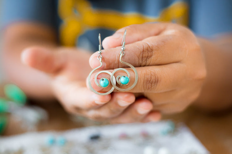 These wire sculpture earrings are creatively bent and twisted into distinct shapes by a talented artisan in San Juan de Oriente, Nicaragua. All earrings are made with "alpaca" wire and semi-precious stones and are hung on surgical stainless steel ear wires. Fun and funky for the urban jungle.