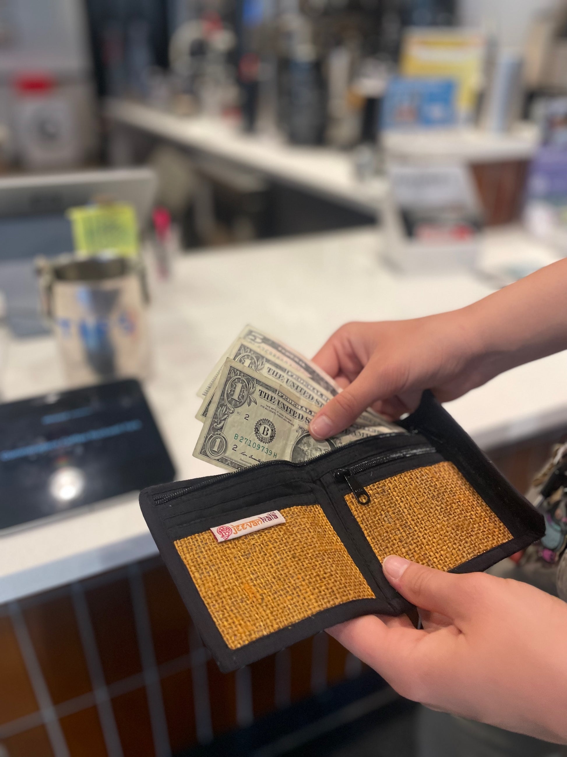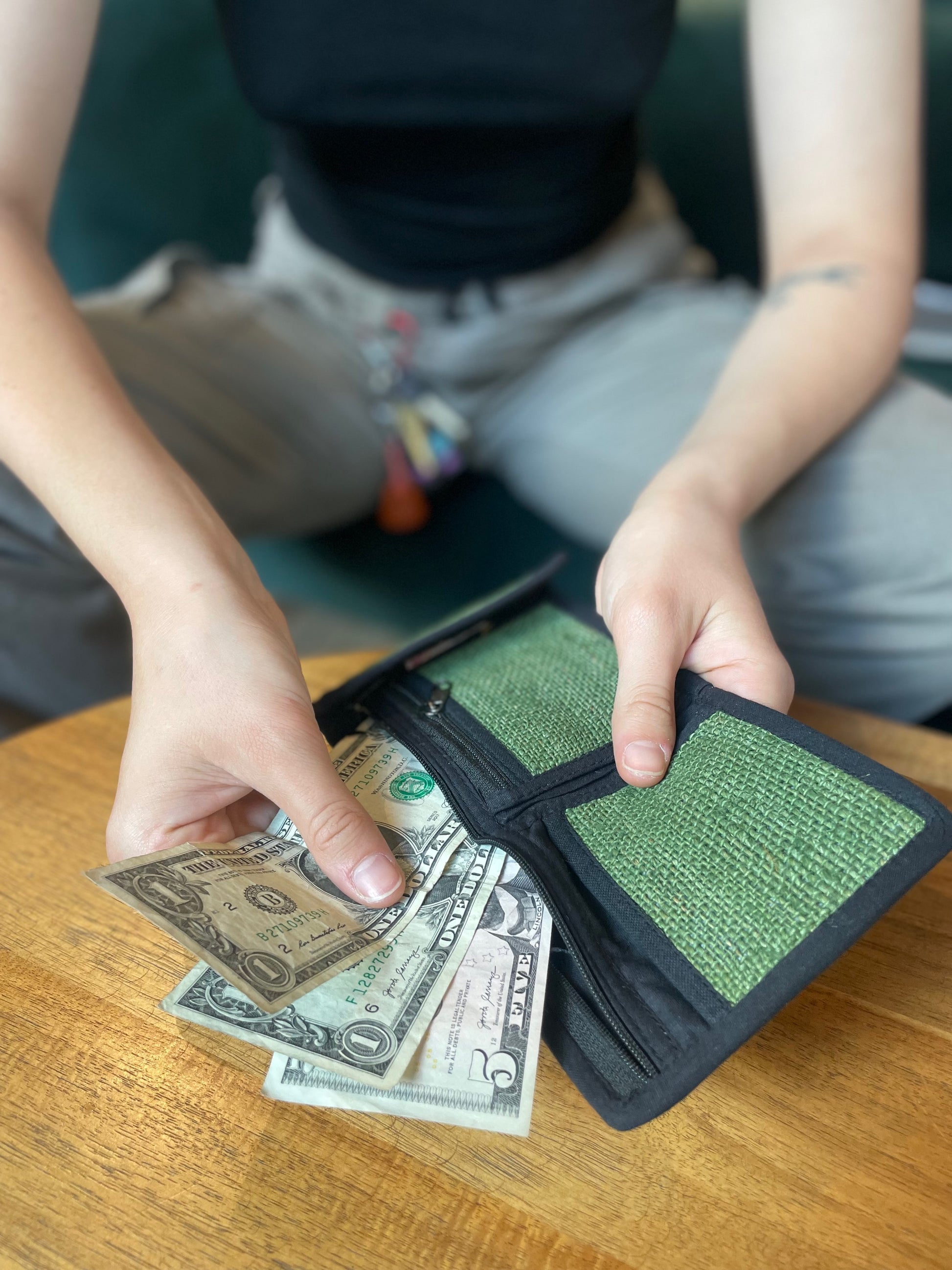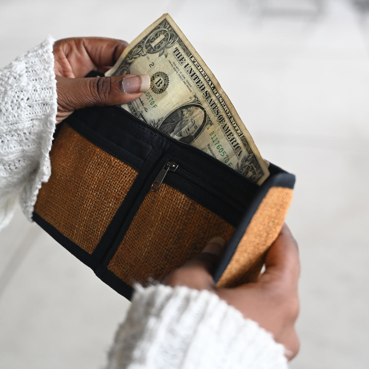 These high-quality, upcycled items are made with sustainably grown hemp fabric. This wallet has two interior hemp pockets, along with two zippered pockets and a velcro closure. Measures approximately 4 x 4.5 inches when closed. Made by artisans in Nepal whose work supports a non-profit organization focused on healthcare initiatives and educational projects directly benefiting Nepalis living in impoverished and remote mountain areas of Nepal. Fair trade.