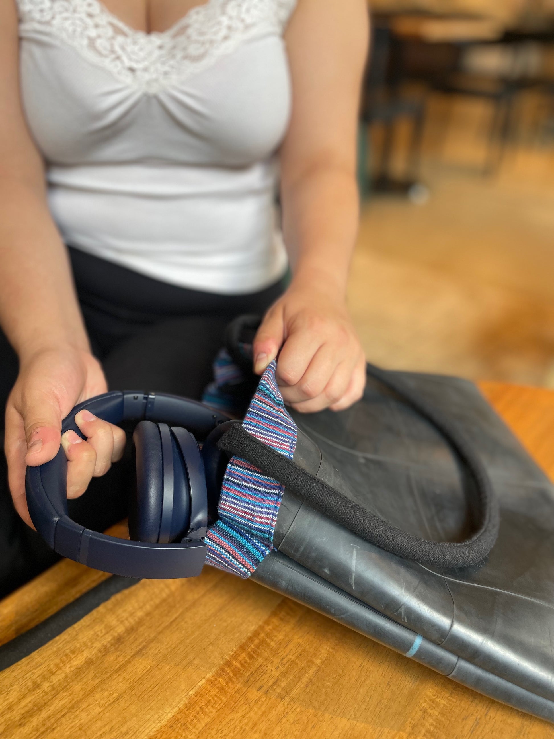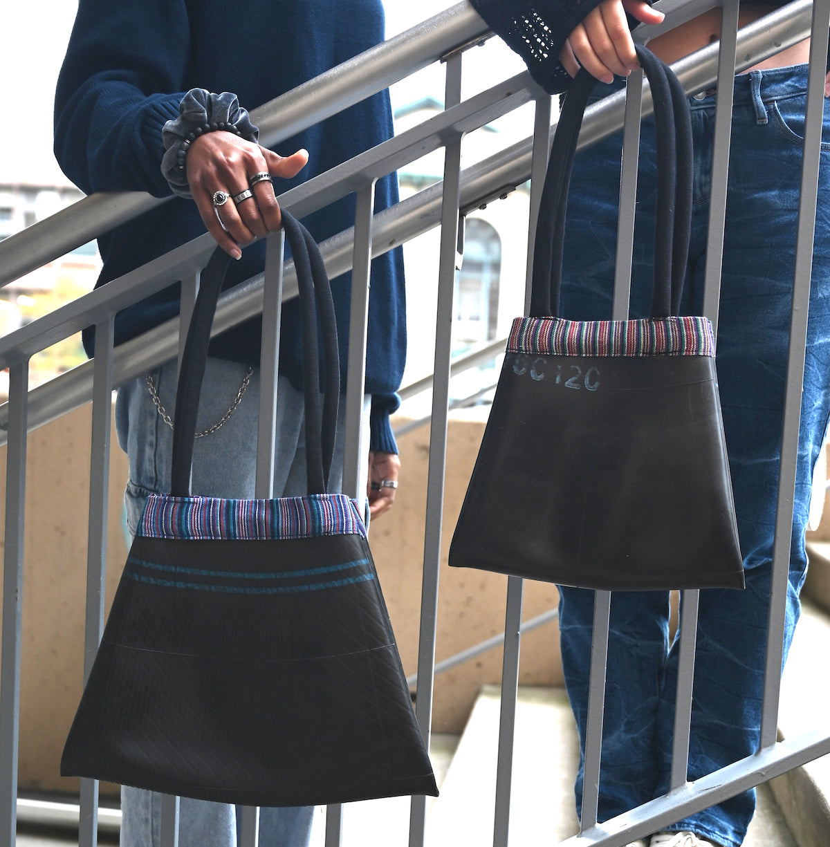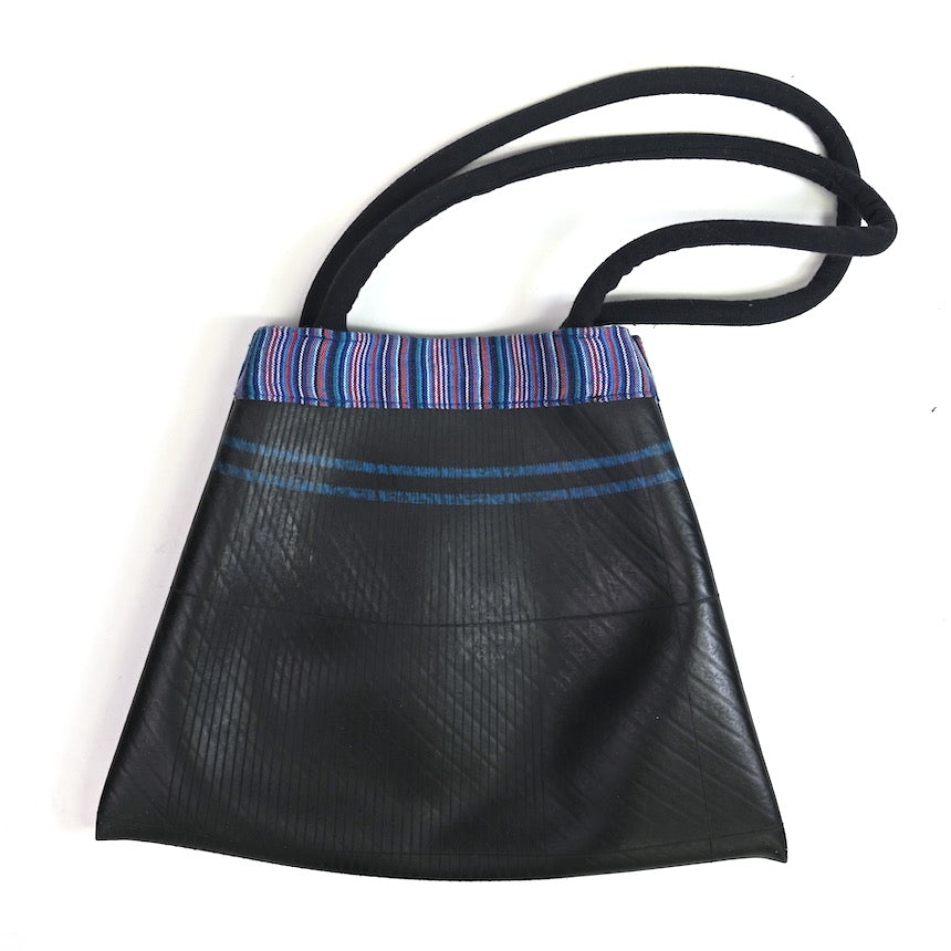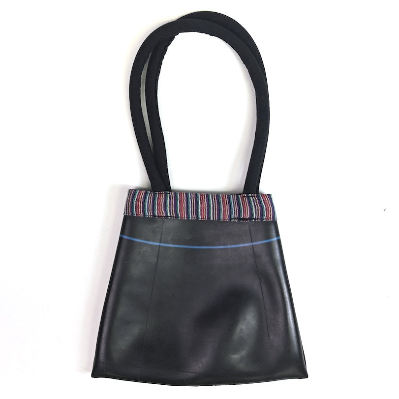 These high-quality, upcycled bags are made with the rubber from repurposed inner tubes and trimmed with hand-loomed cotton fabric. This sleek handbag comes in two sizes and features sturdy, fabric-covered rubber handles for an easy, comfortable grip. Because of the nature of the rubber, each bag is unique and may have colorful markings on the material which adds character to each piece. The large handbag measures approximately 15 inches at the base x 12 inches high (22 inches high including handles). The small handbag measures approximately 11.5 inches at the base x 10.5 inches high (20 inches high including handles). Made by artisans in Nepal whose work supports a non-profit organization focused on healthcare initiatives and educational projects directly benefiting Nepalis living in impoverished and remote mountain areas of Nepal. Fair trade.