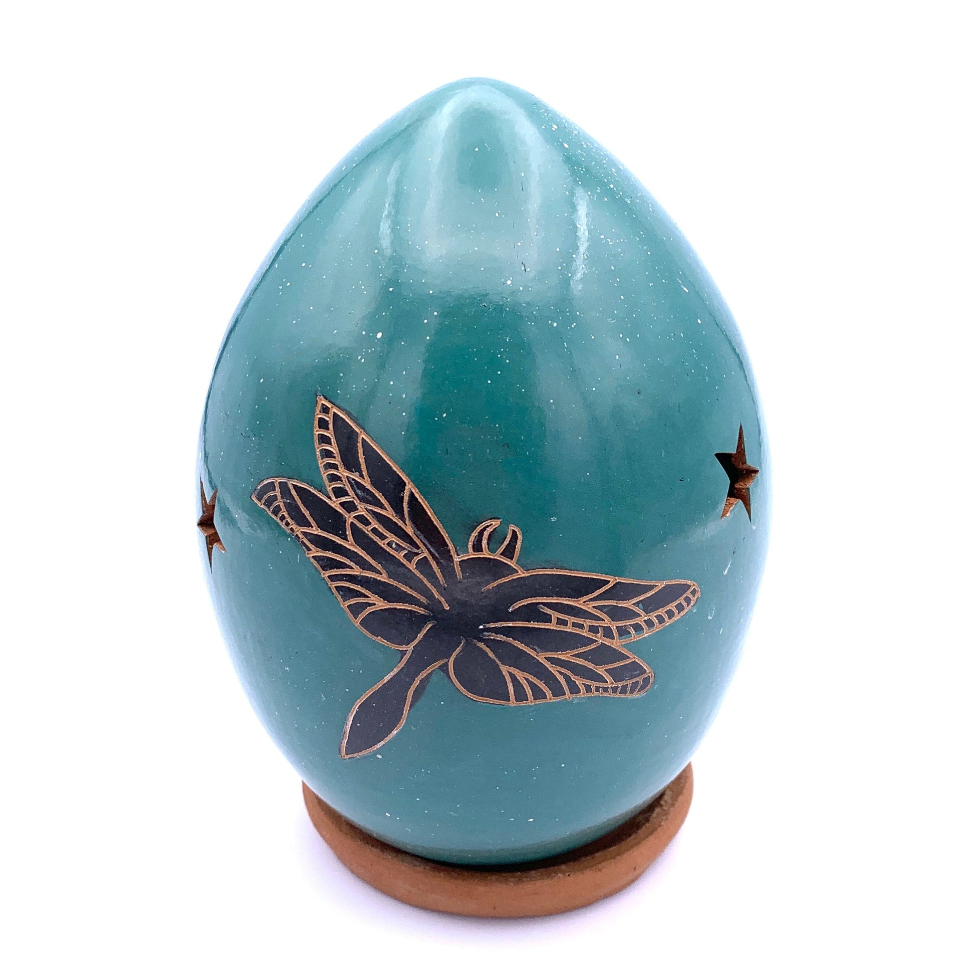 This Dragonfly Silhouette Luminary is handcrafted in a family workshop in the community of San Juan de Oriente, Nicaragua. Each ceramic luminary is created from local clay, turned on a kick wheel, and hand-painted. The artisan uses a sharpened bicycle spoke to carve and etch the design into the clay. Finally, it is fired in a wood-burning kiln. For use with tea light candles, fairy lights, or electric lights. Approximate size: 4" wide x 5" high. Fair Trade.