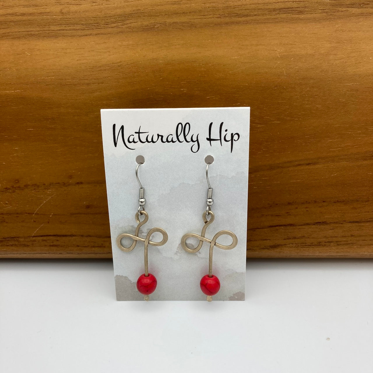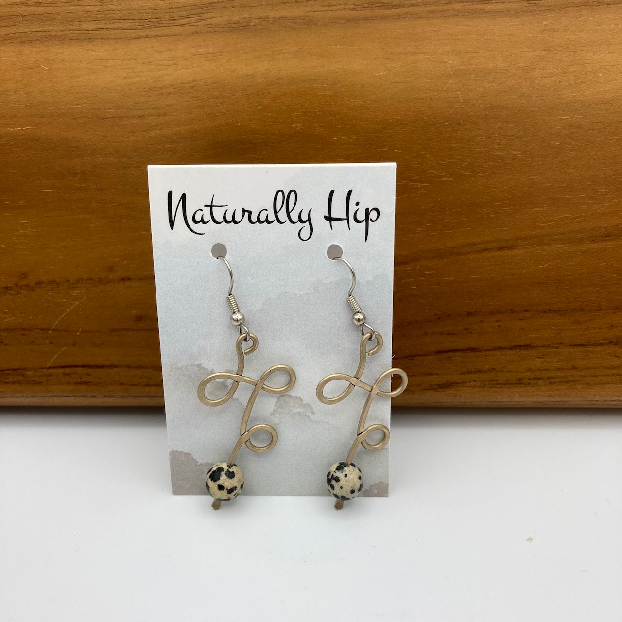 These wire sculpture earrings are creatively bent and twisted into distinct shapes using "alpaca" wire and semi-precious stones. Surgical stainless steel ear wires. Approximate length: 2" - 2.75" Fair trade.